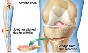 Knee osteotomy is a surgical procedure that may be recommended if you have arthritis damage in just one area of your knee. In knee osteotomy, a surgeon removes or adds a wedge of bone to your upper shinbone (tibia) or lower thighbone (femur). This helps shift your body weight off the damaged portion of your knee joint.